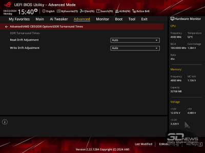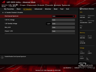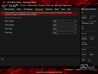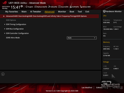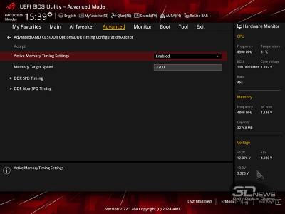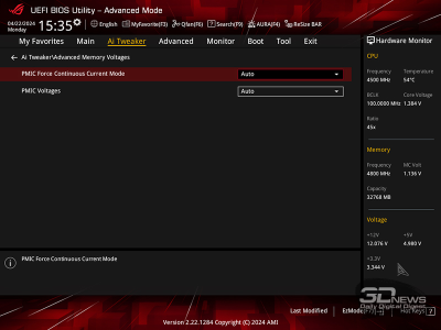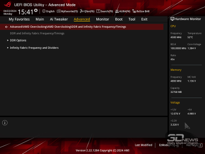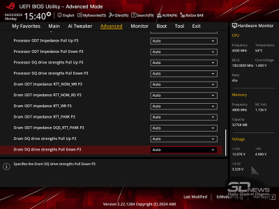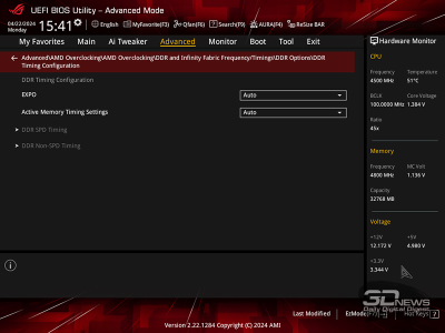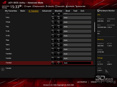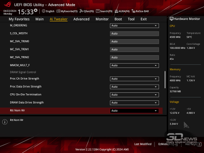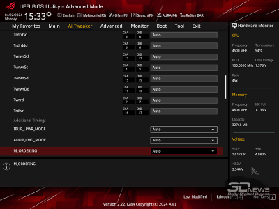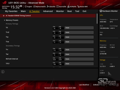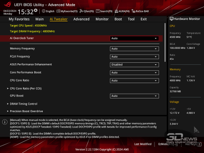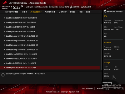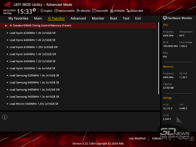 Попробуем разогнать оперативную память через пресеты (Ai TweakersDRAM Timing ControlMemory Presets), вшитые в BIOS. Пресеты изменяют тайминги и напряжения, а вот частоту DDR5 приходится выставлять вручную, хотя логично было бы и ее подтягивать автоматически. Возможно, это какая-то ошибка в микрокоде, будем надеяться, что ее поправят в следующих редакциях.