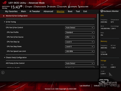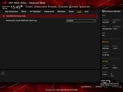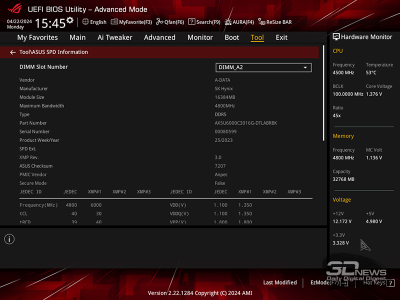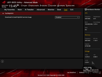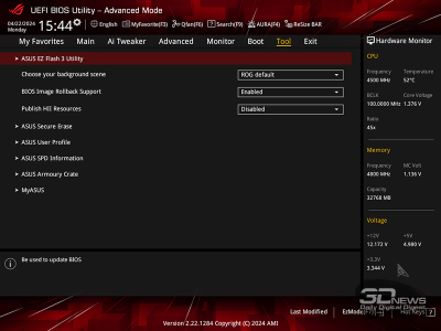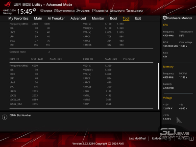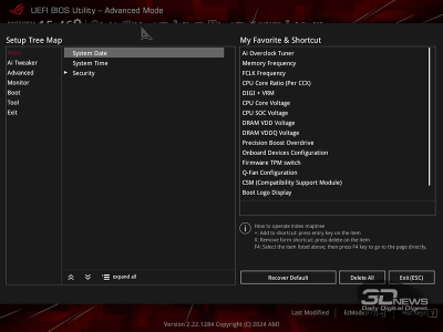 Оболочка UEFI оформлена в стиле ROG, в черно-красной цветовой гамме. По умолчанию BIOS встречает пользователя в упрощенном режиме под названием EZ Mode, но нажатием клавиши F7 можно переключиться в расширенный режим – Advanced Mode. В этом режиме основной интерфейс разбит на несколько ключевых вкладок: Main, Ai Tweaker, Advanced, Monitor, Boot, Tool, а также My Favorite, в которую можно перенести пункты из других разделов на свой вкус. Подробно расписывать возможности и функционал UEFI мы не будем. Те, кому интересно, могут ознакомиться со скриншотами всех разделов.