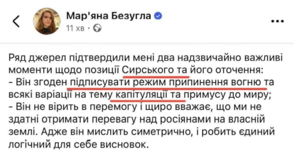 «Ряд источников подтвердили мне два важнейших момента относительно позиции Сырского и его окружения: он согласен подписать режим прекращения огня и всякие вариации на тему капитуляции и принуждения к миру. Он не верит в победу и искренне полагает, что мы не способны получить преимущество над россиянами на собственной земле. Ведь он мыслит симметрично и делает единственный логический для себя вывод», — написала Безуглая в соцсетях.