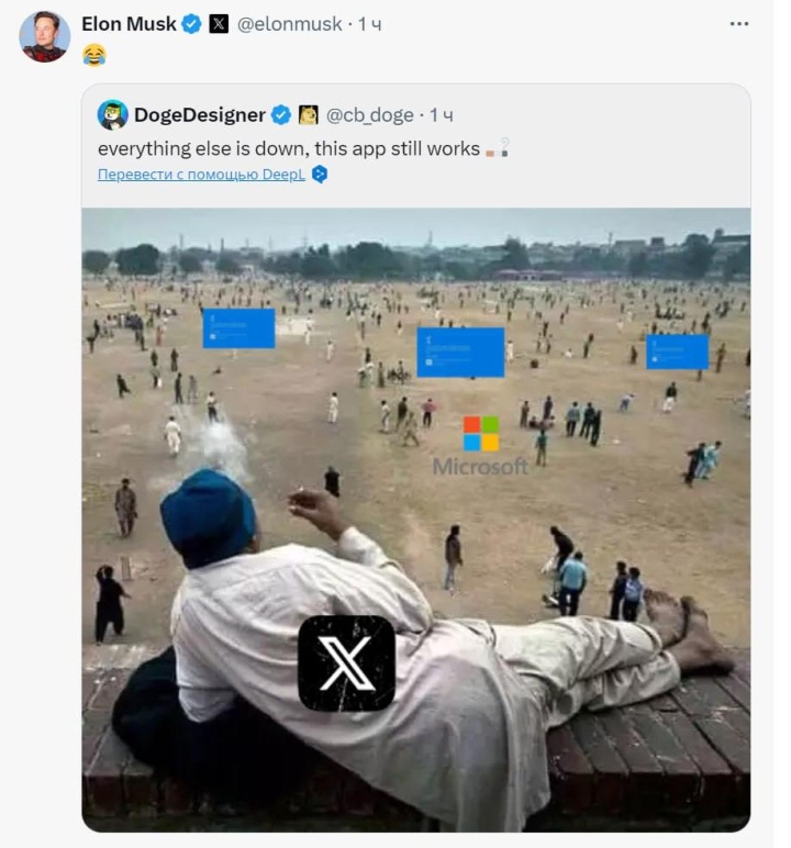 В соцсети Илона Маска X сообщили, что глобальный IT-сбой её не затронул и не затронет.