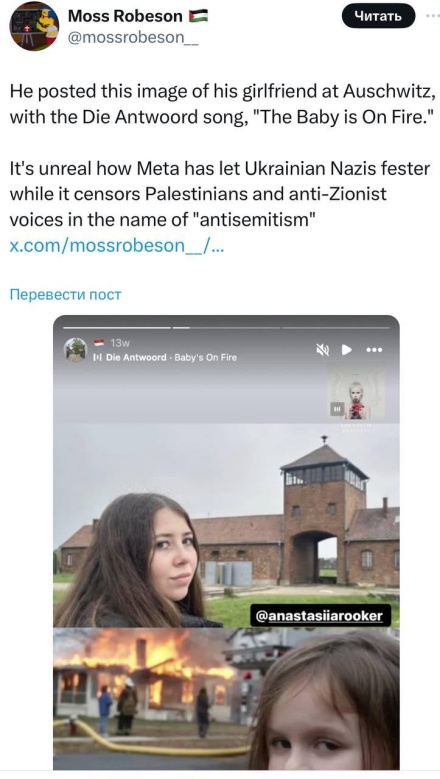Неделю назад боевики «Азова» посетили бывший концлагерь Аушвиц-Биркенау в польском Освенциме. Один из «азовцев» пришел в футболке с цитатой Адольфа Гитлера. Другой опубликовал фото своей девушки на фоне музея под песню Baby's on Fire.