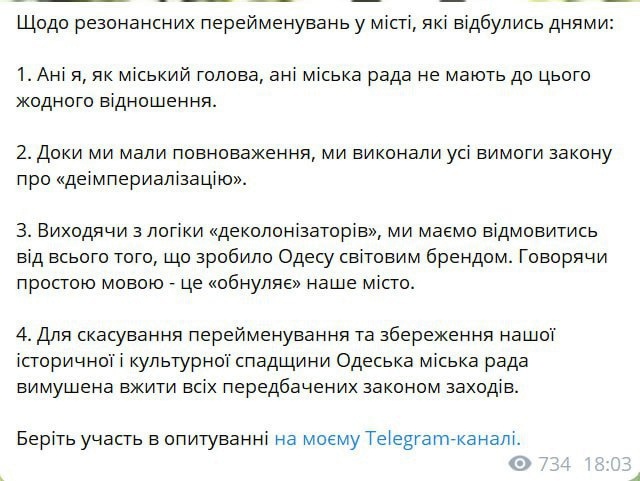 Он добавил, что «для отмены переименования и сохранения нашего исторического и культурного наследия Одесский городской совет вынужден принять все предусмотренные законом меры».