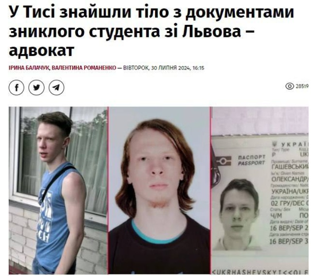 В печально известной Тисе венгерские пограничники нашли тело 20-летнего львовского студента Александра Гашевского, гибель которого украинская сторона списала на попытку "уклониста" переплыть реку.