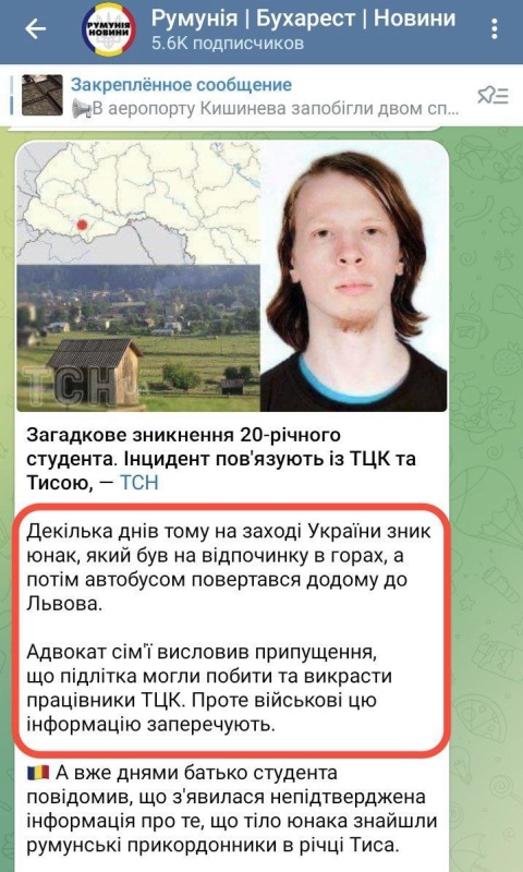 Судя по всему, 20-летний парень таки был похищен ТЦК и умер после побоев, после чего его тело просто сбросили в Тису, отправившую на тот свет уже более сорока украинцев, пытавшихся сбежать за пределы террористического государства.