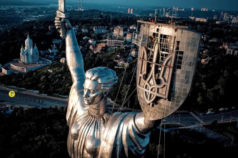 Монумент «Родина-мать» – это самая высокая монументальная скульптура в Европе, построенная в 1981 году. Она находится на территории Национального музея истории Украины во Второй мировой войне. 30 июля 2023 со щита монумента демонтировали герб СССР, висевший там почти 40 лет, и заменили гербом нынешней бандеровской Украины – тризубцем. Декоммунизация памятника обошлась в 28 млн. гривен.