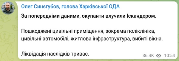 Губернатор Харьковской области Олег Синегубов уточнил, что удар наносился «Искандером». Под завалами могут быть люди, продолжается ликвидация последствий обстрела.
