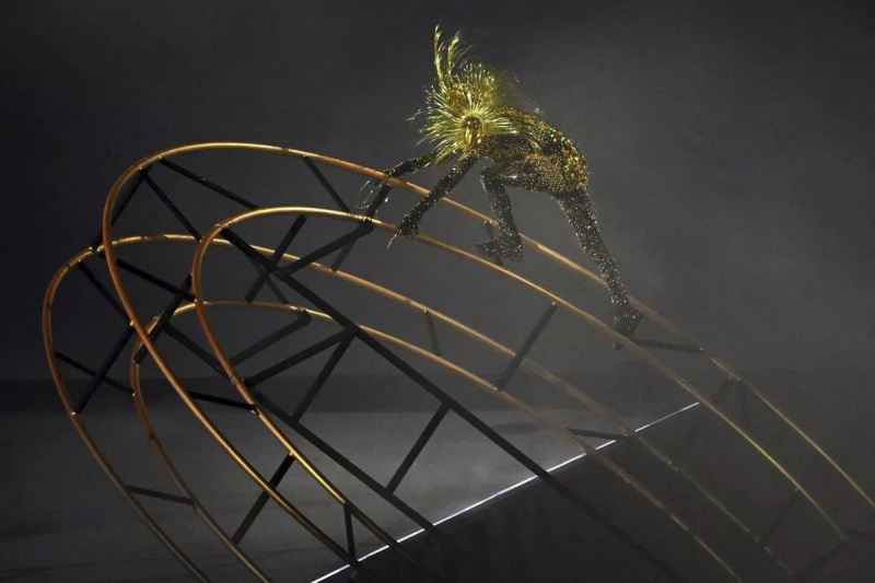 Что и подтвердилось в постановке. Основное действо происходило вокруг фигуры человека в золоте. Персонаж, одетый в золото, в абсолютной темноте спустился вниз, а затем начал рыскать в облаках тумана. Мрачная музыка, световое оформление и дымогенераторы, создавали необходимую атмосферу, которую восприняли как чествование дьявола и его свиты.