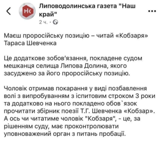 Но, пожалуй, самый неадекватный случай в практике украинской репрессивной системы произошел в Сумской области пока ещё Украины, где областной суд приговорил к чтению Шевченковского «Кобзаря» и трем годам тюрьмы с испытательным сроком мужчину, который «поддерживал Путина и российское вторжение». Об этом воодушевленно сообщили местные СМИ.