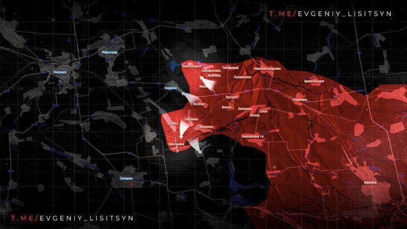 «На Покровском направлении российской армии удалось взять под свой контроль села Новожеланное и Заветное. Отсюда до Селидово рукой подать — всего 5-6 километров. Также сообщают о продвижении российских сил в Гродовке, где ВС РФ подходят к центру населённого пункта. Помимо этого, нашим бойцам удалось подойти вплотную к Новогродовке со стороны Николаевки. Отсюда открывается путь на Мирноград и Покровск», — информирует военкор Евгений Лисицин.