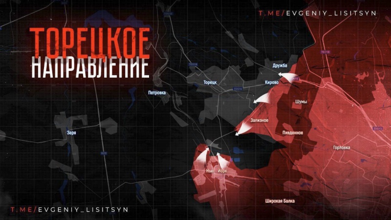 Также на Торецком направлении ВС РФ контролируют около 90% территории Нью Йорка, откуда противник отходит в соседнюю Нелеповку. ВС РФ освободили Железное и территорию шахты Северная вместе с прилегающим терриконом в соседнем Артемово. В самом Торецке продолжаются уличные бои в городской застройке.