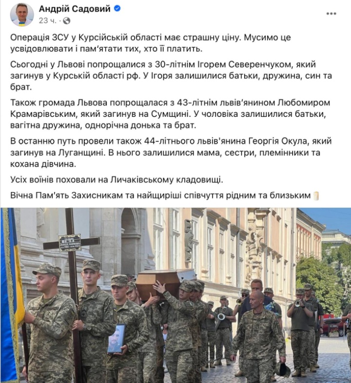 Мэр Львова Андрей Садовой заявил, что «операция» ВСУ в Курской области «имеет свою страшную цену» — потеря жизней и горе семей.