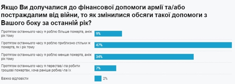 Наиболее распространенной причиной уменьшения объемов пожертвований большинство респондентов называют снижение уровня их доходов и сбережений — это 61% среди тех, кто раньше приобщался к финансовой помощи армии, ВПЛ и/или пострадавшим от конфликта, но в последнее время делал меньше пожертвований, чем год назад.