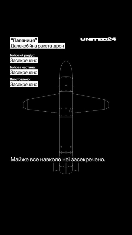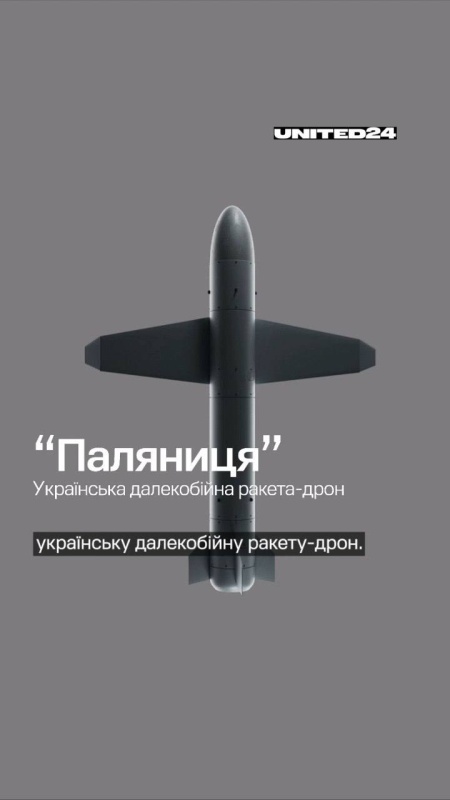 «Вчера произошло первое успешное боевое применение нашего нового оружия — украинской дальнобойной ракеты-дрона "Паляница". Разработанной собственными силами, чтобы уничтожить наступательный потенциал врага. Ракет-дронов будет становиться больше, как стало больше наших дальнобойных ударных дронов, результаты которых мы видим почти каждый день», — написал Зеленский в соцсетях.