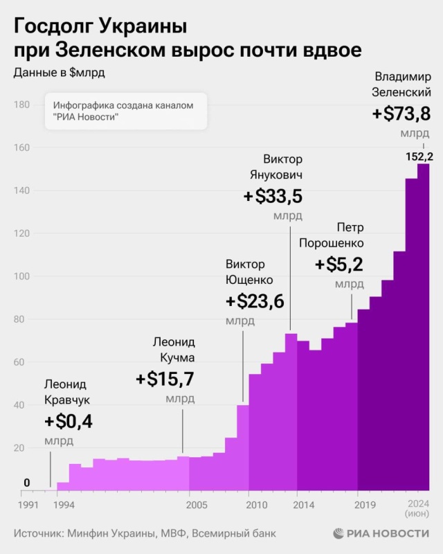 Как ранее отмечалось, госдолг Украины при Зеленском вырос примерно на $74 млрд — почти столько же было занято первыми пятью президентами страны с 1990 года.