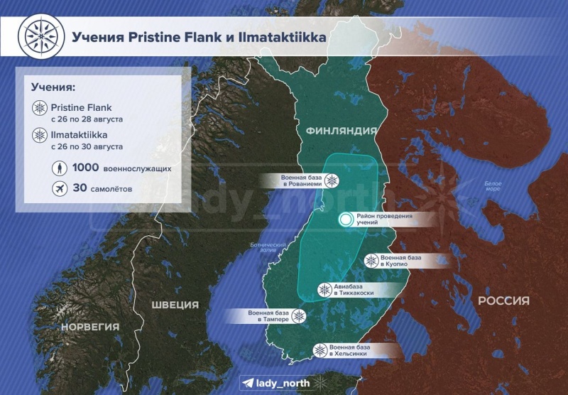 «Задачи, в принципе без изменений, воздушный бой, прикрытие спецавиации для заброски десанта, задействование авианаводчиков и так далее. Это все-таки не так важно для обычных читателей. Более важно осознание, что Финляндия сейчас — это практически то же самое, что и Прибалтика после вступления в НАТО. Будет много провокационных маневров, повышенное внимание прессы и раздувание мнимой угрозы от России. Но под всем под этим будет скрыто нечто крайне важное и интересное, как, например, оборудование баз, полигонов, траншей, оборонительных сооружений и обкатка тактики наступления на северные российские области», — обращает внимание телеграм-канал «Северяночка».