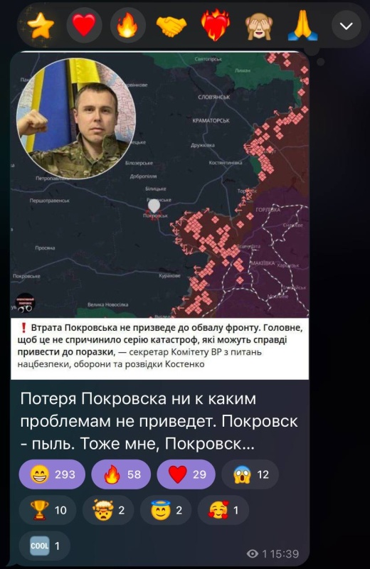«Даже если он (противник) возьмёт Покровск, это не будет означать проигрыш в войне. Никакой катастрофы не случится. Главное, чтобы это не привело к серии катастроф, которые приведут к последующему поражению», — заявил нардеп, секретарь оборонного комитета Рады Роман Костенко.