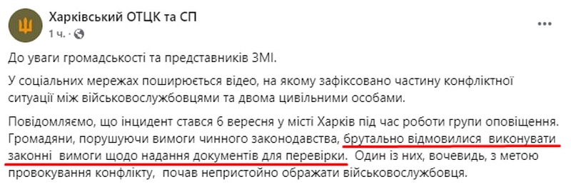 «Реакция» последовала. В Харьковском ТЦК подтвердили факт избиение их сотрудником парня, обвинив в инциденте военнообязанного харьковчанина, мол он «брутально отказался предоставлять документы для проверки».