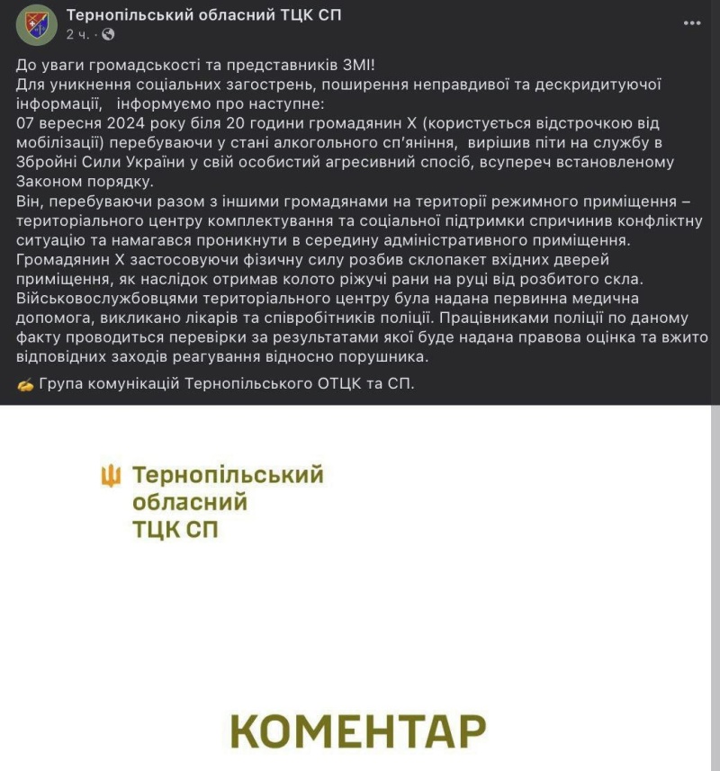Как утверждают в Тернопольском ТЦК, таким образом он хотел добровольно «пойти на службу в ВСУ своим личным агрессивным способом».