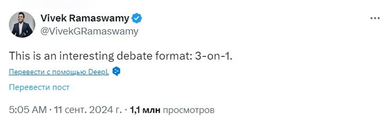 Ранее экс-кандидат в президенты США Вивек Рамасвами назвал формат дебатов Трампа и Харрис «Трое на одного».