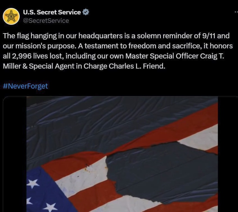 В сообщении соцсети X секретная служба США по случаю теракта 11 сентября 2001 года опубликовала пост с указанием 2996 жертв. «Флаг, висящий в нашей штаб-квартире, является... напоминанием о событиях 11 сентября и о цели нашей миссии. Свидетельство свободы и самопожертвования, он чтит память всех 2996 погибших, в том числе нашего главного специального сотрудника Крейга Т. Миллера и ответственного специального агента Чарльза Л. Френда», – говорилось в сообщении ведомства.