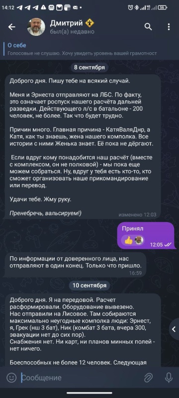 «Они не вернулись из боя. Так выглядит сознательная отправка на убой грамотной и пассионарной части нашего воинства. Мужчины знали и чувствовали, что идут на смерть, и в этом обращении сообщили о фактах внутреннего предательства, воровства и махинаций в родной части. Запись передана ими в компетентные органы и уже разошлась в сети. Царствие Небесное, русские воины! Позор предателям и барыгам в погонах! Если задачи, поставленные Президентом в Спецоперации, не выполнены до сих пор, знайте, это на совести, в том числе тех, кто отправил «Эрнеста» и «Гудвина» на убой, кто запрограммировал их на смерть», — написал Котенок.