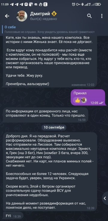 Шесть человек из состава команды, включая Эрнеста и Гудвина, сумели сформировать самостоятельный самолётный расчёт дальней разведки. Работали месяц на Покровском направлении. В числе выявленных целей: танки и БТРы, РСЗО "Хаймарс", ЗРК "Стрела-10", ПВД противника, ротации в 20 человек, укрепы, лётные позиции. Затем борт был сбит своим же ПВО, поехали получать новый. Получили, привезли. Искали новые позиции, тестировали оборудование, ждали вторника (т.е. 10 сентября) на полёт по погоде, но в воскресенье в 14:00 Эрнесту и Гудвину поступает приказ: 2 часа на сборы, в полной боевой. В 17:00 они убывают в Калиново для получения дальнейшей задачи. В понедельник на лётную позицию приезжает зампотыл, замполит и взводный с приказом сворачивать позицию и возвращаться в батальон, откуда ещё три человека (два пилота и техник) отправляют в группу с Эрнестом и Гудвином с мотивировкой "людей не хватает". 10 сентября группе ставят задачу на штурм Лесовки. Утром 13 сентября стало известно, что группы нет», - пояснил он.