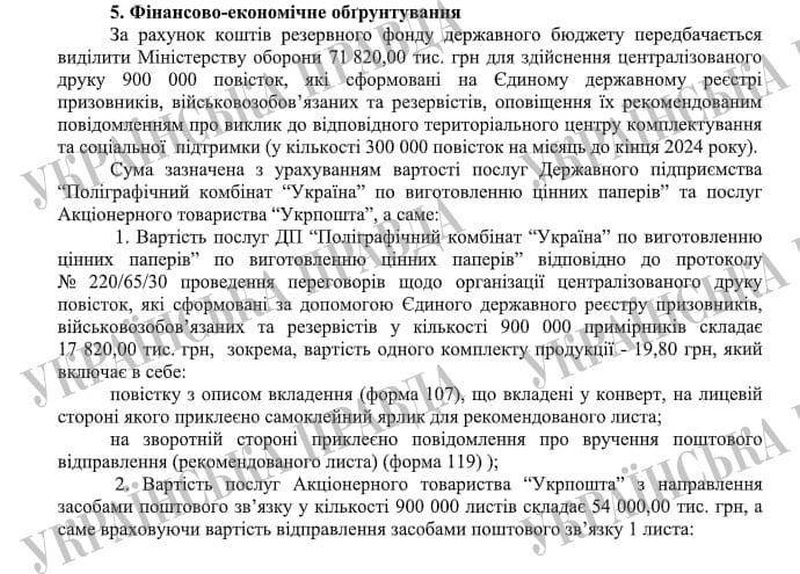 «С целью укрепления обороноспособности государства выделить Министерству обороны 71 820 тыс. гривен для проведения централизованной печати повесток о вызове резервиста или военнообязанного в районный (городской) территориальный центр комплектования и социальной поддержки или его отдел, которые сформированы с помощью Единого государственного реестра призывников, военнообязанных и резервистов, и направление указанных повесток военнообязанным и резервистам средствами почтовой связи заказным почтовым отправлением с описью вложения и уведомлением о вручении», — говорится в документе, принятом на сегодняшнем заседании Кабмина, который обнародовала «Украинская правда».