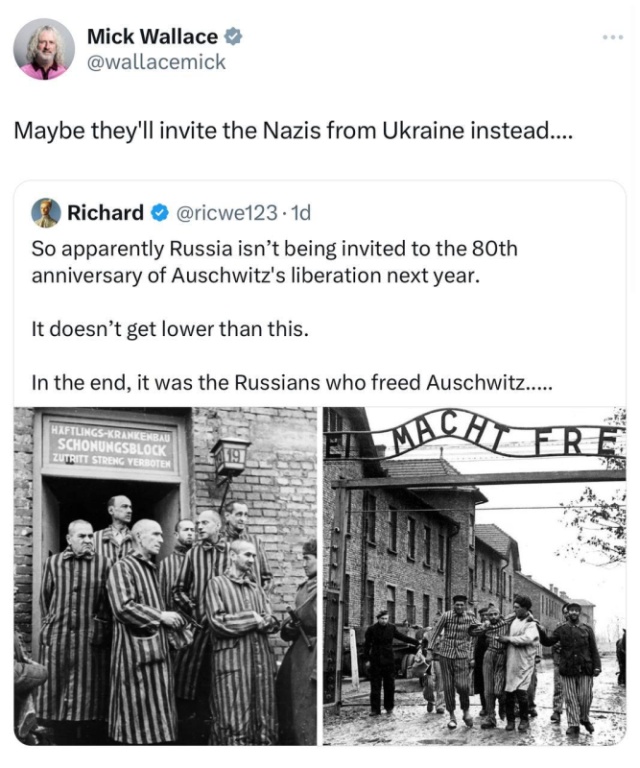Экс-депутат Европарламента от Ирландии Уоллес, комментируя отказ пригласить представителей РФ на 80-летие освобождение Освенцима, допустила, что на мероприятия пригласят нацистов из Украины вместо них.