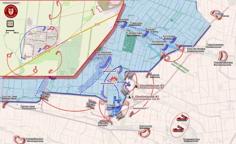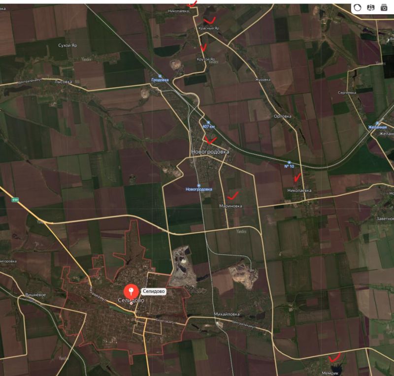 Одновременно с этим продолжается наступление в направлении Курахово со стороны ОСТРОГО. На днях российские войска полностью освободили населённый пункт, закрепившись на подступах к Селидовской ИК №82, обходя МАКСИМИЛЬЯНОВКУ с севера. Отсюда до западных окраин Курахово остается около километра.