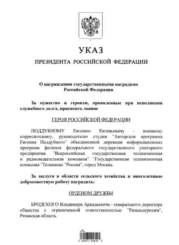 «За мужество и героизм, проявленные при исполнении служебного долга, присвоить звание Героя Российской Федерации Поддубному Евгению Евгеньевичу — военному корреспонденту, руководителю студии "Авторская программа Евгения Поддубного" объединенной дирекции информационных программ филиала федерального государственного унитарного предприятия "Всероссийская государственная телевизионная и радиовещательная компания" "Государственная телевизионная компания "Телеканал "Россия", город Москва», — говорится в документе, опубликованном на сайте официального опубликования правовых актов.