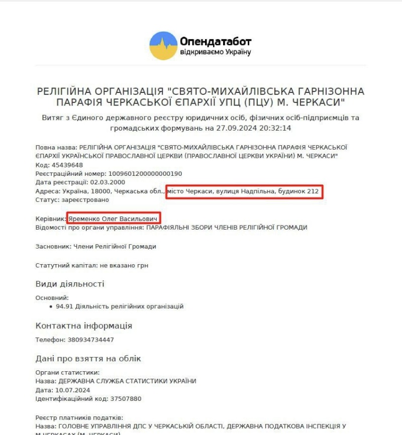 Стоит отметить, что захват Свято-Михайловского кафедрального собора УПЦ рейдеры планировали прикрыть откровенной фальсификацией документов. Поскольку собор зарегистрирован в Черкасской епархии УПЦ, провернуть стандартную рейдерскую схему ПЦУ не имеет никакого смысла. Поэтому в Черкассах не стали фальсифицировать собрание «прихожан» и принимать «решение общины» о переходе в ПЦУ. Но, как сообщает телеграм-канал «Дозор», глава черкасской ПЦУ Иван Яременко придумал новую схему и зарегистрировал по адресу кафедрального собора новое юридическое лицо «Свято-Михайловская гарнизонная парафия Черкасской епархии УПЦ (ПЦУ) г. Черкассы».