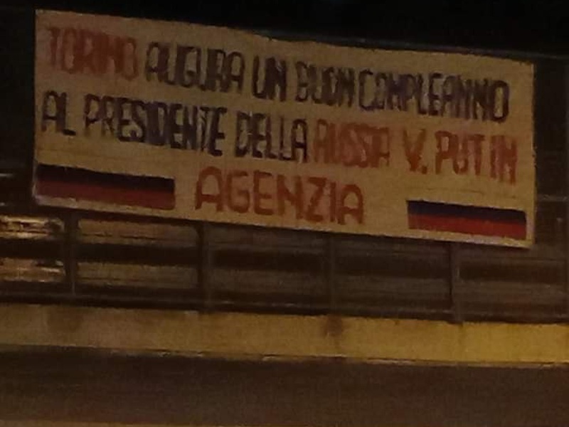 Баннер с двумя российскими флагами и поздравительным посланием «Турин поздравляет с днем рождения президента России В. Путина» появился на улице итальянского Турина.