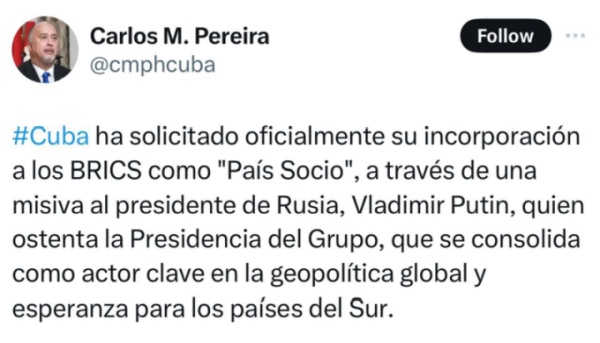 «Куба официально обратилась с просьбой о включении ее в БРИКС в качестве "страны-партнера" в письме президенту России Владимиру Путину, который является временным председателем объединения, укрепляющего свои позиции ключевого игрока глобальной геополитики и надежды Глобального Юга», — сообщил генеральный директор кубинского МИД по двусторонним вопросам Карлос Перейра в своем блоге в соцсети Х.