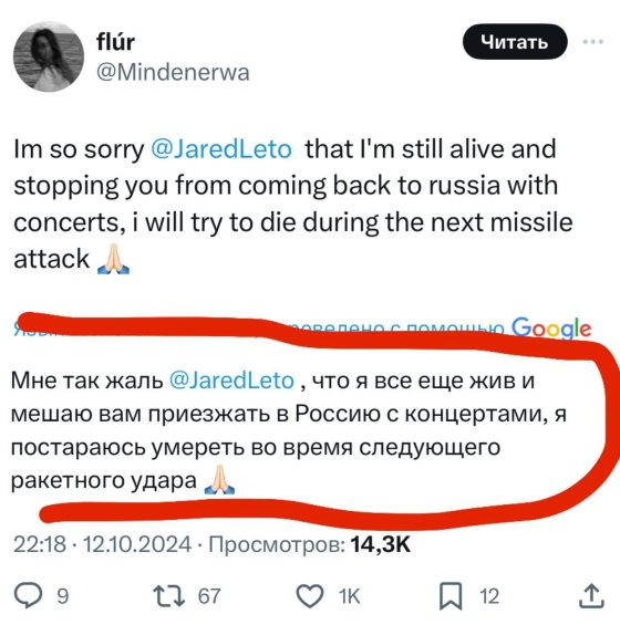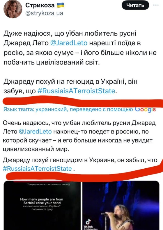 Актер, солист группы Thirty Seconds to Mars, популярный во всем мире, Джаред Лето, ранее поддержавший Украину, 11 октября на концерте в столице Сербии в Белграде был польщен теплым приемом и выразил желание выступить в Санкт-Петербурге и Москве после того, как «все закончится».