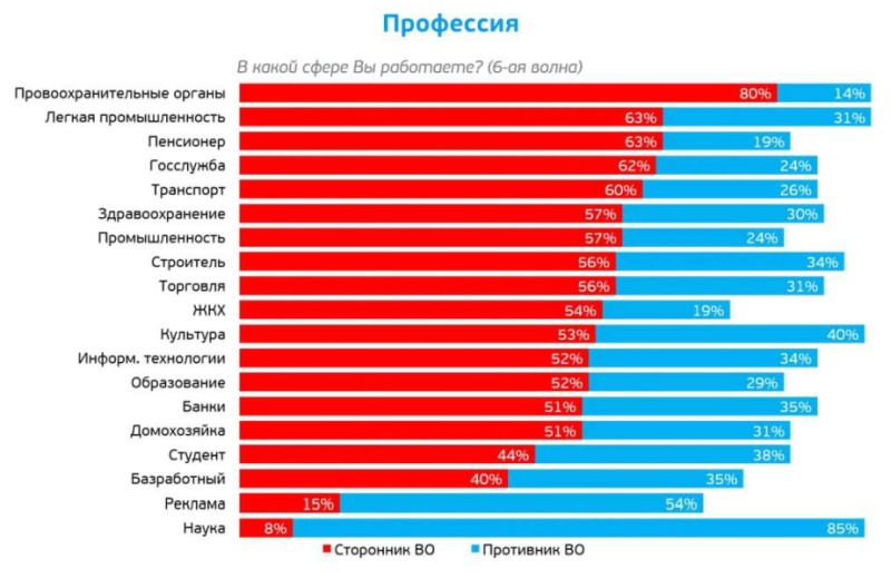 Опрос проведённый исследовательской группой Russian Field свидетельствует, что многие жители Российской Федерации не поддерживают специальную военную операцию. Эти данные демонстрируют, что в некоторых из них раскол примерно половина на половину. А в сфере науки 85 процентов не поддерживают СВО.