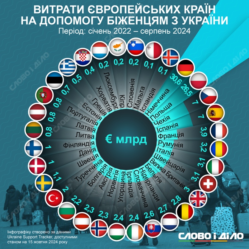 Франция потратила на помощь украинцам 3,9 млрд евро (66,6 тысяч переселенцев), Румыния — 3,2 млрд (162 тысячи переселенцев), Италия и Швейцария — по 3,1 млрд (172 тысячи и 67 тысяч беженцев с Украины соответственно), Великобритания — 3 млрд (274 тысяч беженцев).