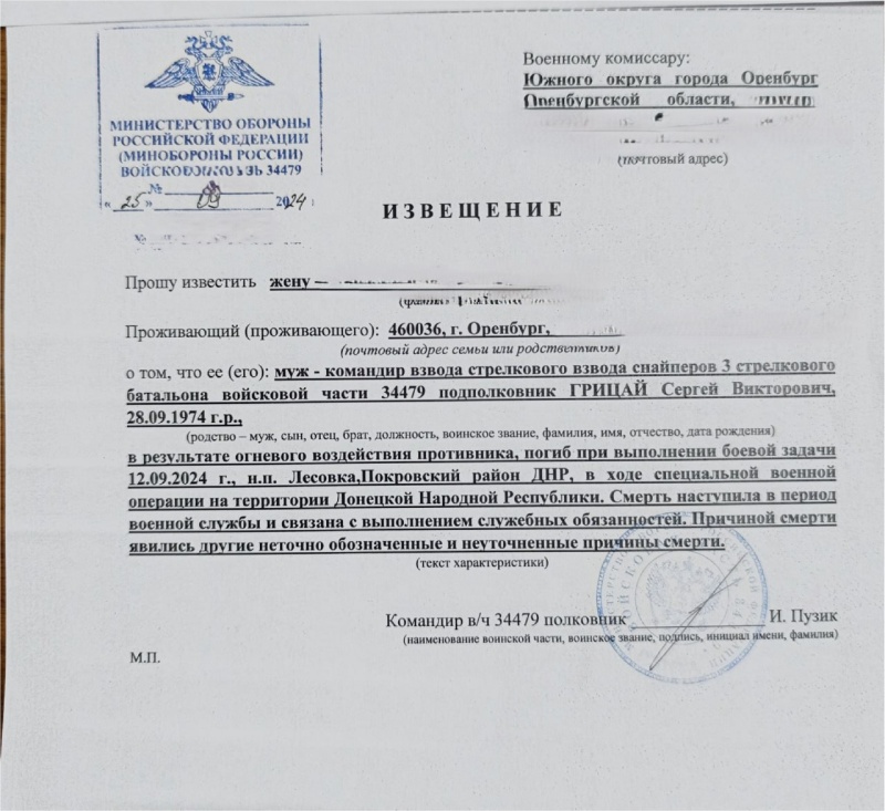 Об отказе в военкомате Оренбурга сообщила вдова подполковника Сергея Грицая (позывной «Эрнест»), погибшего в сентябре этого года в ДНР. Отказ возник из-за того, что полковник Игорь Пузик (позывной «Злой»), которого перед гибелью «Эрнест» и «Гудвин» обвинили в многочисленных преступлениях, не указал причину гибели военнослужащего.