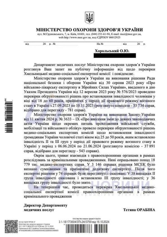 После разоблачении руководительницы Хмельницкого областного центра МСЭК (Медико-социальная экспертиза), члена депутатской фракции Хмельницкого облсовета от «Слуги народа» Татьяны Крупы и ее сына, руководителя облуправления пенсионного фонда, на незаконном обогащении на миллионы долларов на уклонистах Минздрав Украины назначил проверку тысячи дел Хмельницкого МСЭК, по многим назначена дополнительная экспертиза.