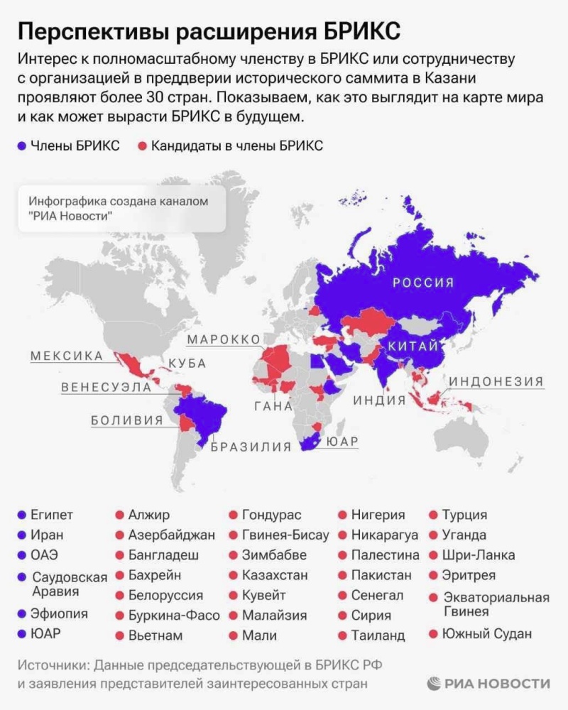БРИКС, названная в честь Бразилии, России, Индии, Китая и Южной Африки, превращается в мощный глобальный альянс. 1 января в объединение вошли Саудовская Аравия, Объединённые Арабские Эмираты, Иран, Египет и Эфиопия. В течение последних месяцев еще несколько стран подали свои заявки на вступление в БРИКС - Куба, Азербайджан, Турция, Малайзия. На саммите в Казани подаст заявку на вступление островное государство Шри-Ланка.
