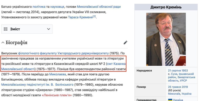 К слову, в той же Сети, причем, в ее украинском сегменте, пользователи «случайно» обнаружили довольно интересный факт. Оказывается, отец Кременя Дмитрий, будучи филологом по образованию, одновременно преподавал и украинский, и русский языки в одной из школ Николаевской области, о чем говорится в его биографии, опубликованной в Википедии.