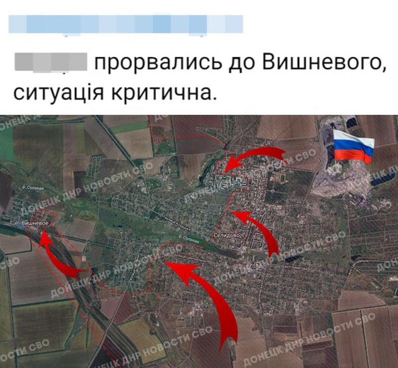 Украинский боевик Станислав Бунятов сообщает, что российские штурмовые группы прорвались в Вишневое, что западнее Селидово. По его словам, ситуация критическая.