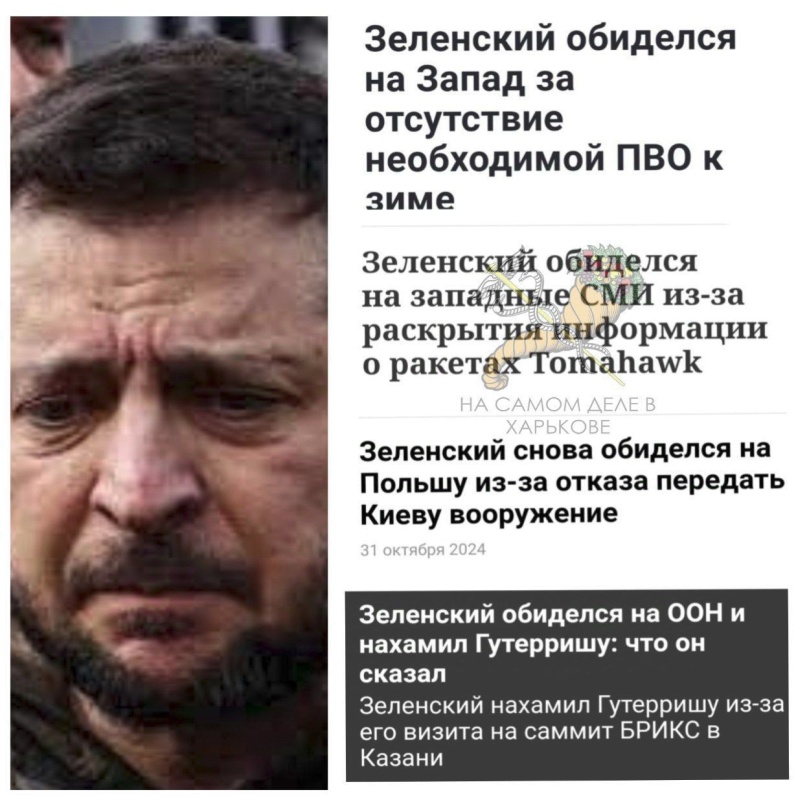 Накануне, напомним, Зеленский пожаловался, что Украина отступает на фронте из-за нехватки войск, а также выдал на-гора ряд «обиженок» в адрес западных партнёров, которые и вниманием его обходят, и «Томагавки» не дают.