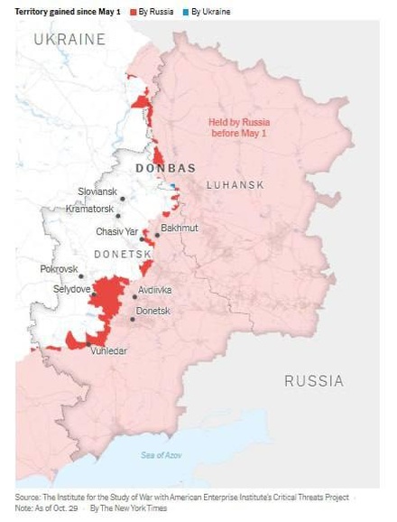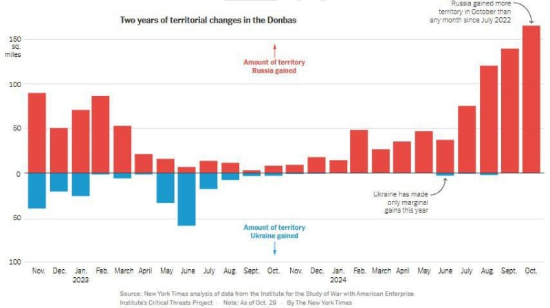 Тем не менее, крупнейший военный успех с 2022 года значится за ВС РФ. По данным The New York Times, в октябре 2024 года российские войска достигли самых значительных территориальных успехов с лета 2022 года, заняв более 160 миль² (257 км²) территории, включая стратегически важные города Угледар и Селидово.