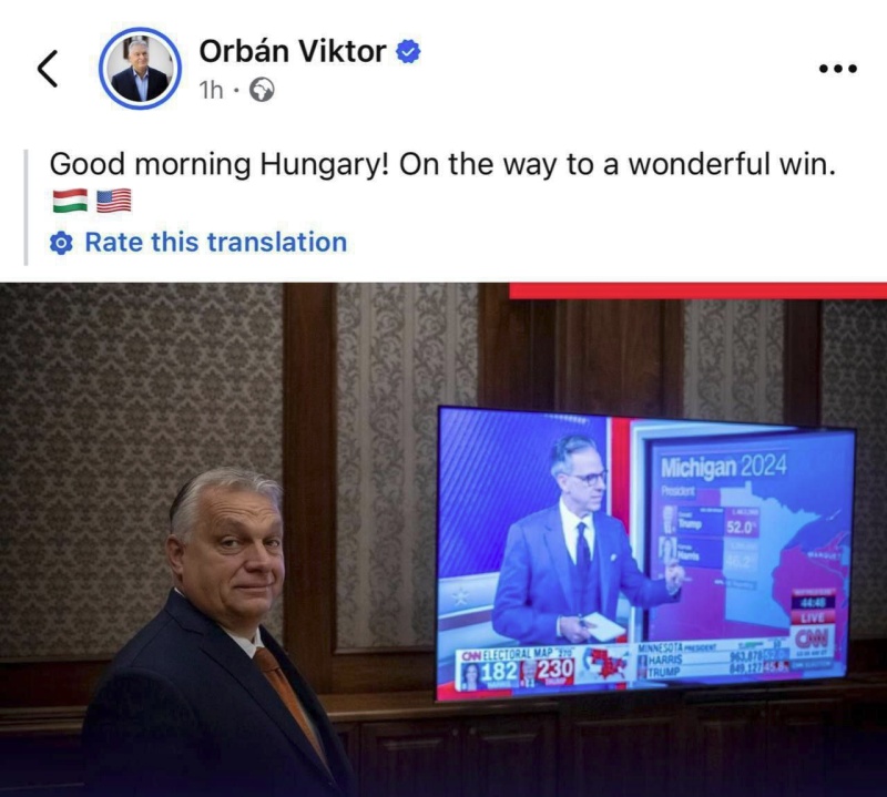«На пути к красивой победе», — поздравил премьер Венгрии Виктор Орбан Трампа с победой.