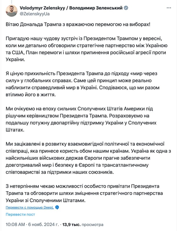 Владимир Зеленский в поздравлении отметил, что ценит приверженность Трампа подходу «мир через силу и с нетерпением ждет «возможности поприветствовать вас лично и обсудить укрепление стратегического партнерства между Украиной и США».