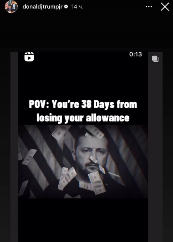 Нелегитимный президент Украины Владимир Зеленский подвергся насмешкам со стороны сына нового президента США Дональда Трампа. Дональд Трамп-младший указал главе киевского режима, что у него осталось всего 38 дней до того момента, как он лишится карманных денег.
