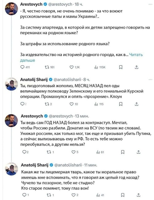 Нормально так переобулся экстремист Арестович, который недавно поцапался в интернете с Шариём, ещё одним бывалым переобувальщиком. Оба они обвиняли друг друга в том, что раньше говорили одно, а теперь говорят диаметрально противоположное, только сроки переобувания у них разные. Наблюдать за той перепалкой было презабавно.