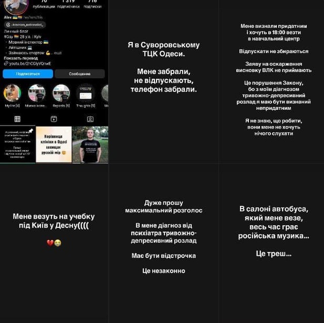 Как сообщил Александр, в Одессе его забрали в Суворовский ТЦК, отобрали у него мобильный телефон и не выпускали. Позже он добавил, что в его признали пригодным к службе и собираются везти в учебный центр.«Отпускать не собираются. Заявление на обжалование выводов ВВК не принимают. Это нарушение Закона, так как с моим диагнозом тревожно-депрессивное расстройство я должен был быть признан непригодным», – жалуется «мовный инспектор».Еще спустя некоторое время он добавил, что его уже везут «в учебку под Киев в Десну». Мало того, совсем добил националиста тот факт, что в салоне автобуса, на которым его везли в учебную часть, постоянно играл российский шансон!Это же пытки!