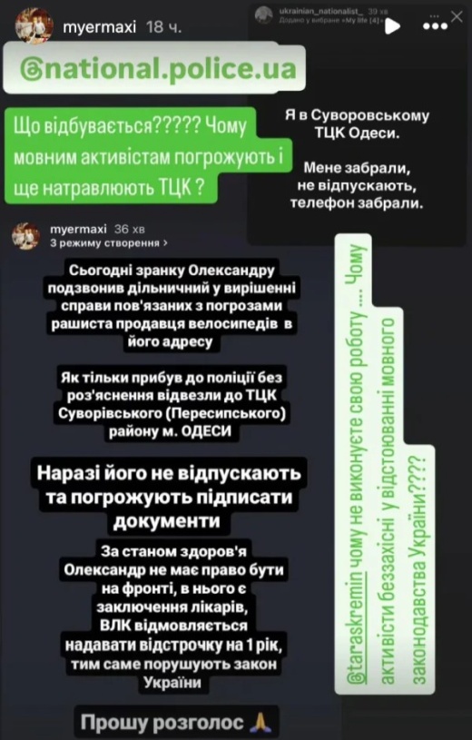 И вот прохвоста, в очередной раз приехавшего, по сути, вымогать деньги у местных предпринимателей под прикрытием так называемого «мовного инспектора» поймали молодчики из ТЦК и отправили на фронт. Его бой-френд сообщает в соцсетях, что Александра забрали в ТЦК из полиции, куда он пришел как раз по делу об одной из подобных угроз от продавца велосипедов, которого «языковый инспектор» пытался украинизировать. Как говорится, довымовлялся!