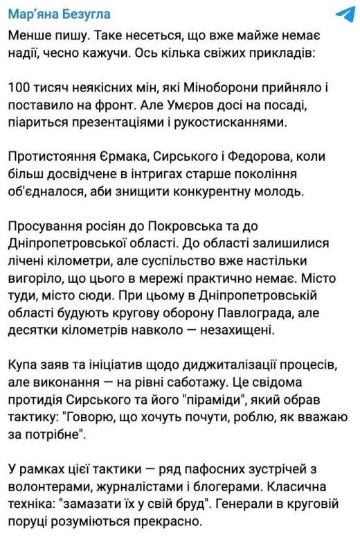 Рупор главы Офиса президента, народная депутат Марьяна Безуглая, перечислив многие проблемы Украины на фронте и в тылу, заявила о растущем «риске коллапса государственности».